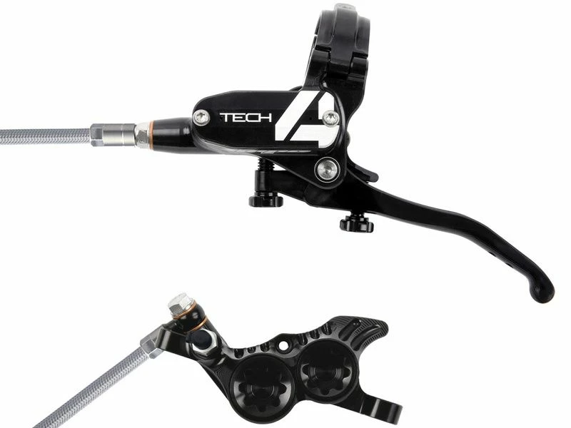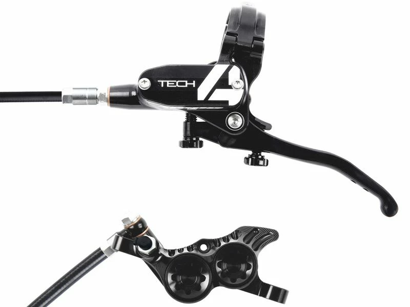 Son maitre cylindre est maintenant équipé de pivot levier monté sur roulements à billes et de nouveaux joints internes réduisant les frictions. L’augmentation de la démultiplication du levier d’environ 30% offre un meilleur feeling et une plus grande puissance tout en réduisant la fatique musculaire. La fixation du maitre cylindre du Tech 4 sur le guidon se fait par un système de collier à charnière très facile d’installation et compatible avec la fixation directe des commandes Shimano ISPEC EV et SRAM Matchmaker en utilisant des adaptateur vendus séparément. Toujours d’actualité, les vis BPC et Reach Adjust permettent d’ajuster la garde du levier et le contact plaquettes sans outil .